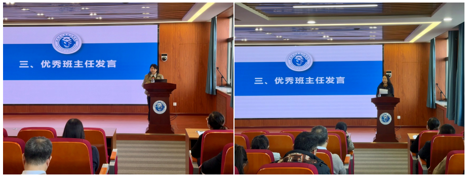 最后,优秀班主任代表袁桂丽、王素琴分享了育人经验。袁桂丽老师作为深耕班主任工作二十余年的资深教师,分享了分年级育人策略:大一注重帮助学生适应大学生活;大二、大三持续营造优良学风,开展学业帮扶;大四针对不同发展方向的学生提供精准指导。王素琴老师结合班主任经历,分析了当代学生在沟通方式、班级活动参与等方面的新变化,提出要建立信任基础、理解学生表达语境、提升心理解读能力。
